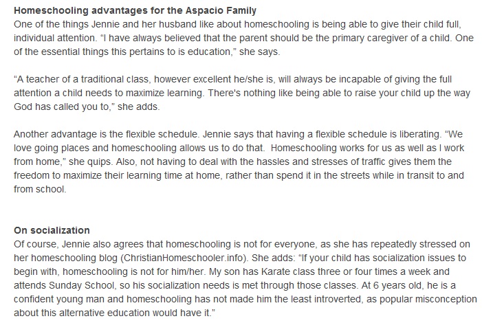 Oh the perks of blogging and online presence! More than being able to work from home through blogging and my virtual assistant jobs, I also get the word out about this wonderful education alternative known as homeschooling.