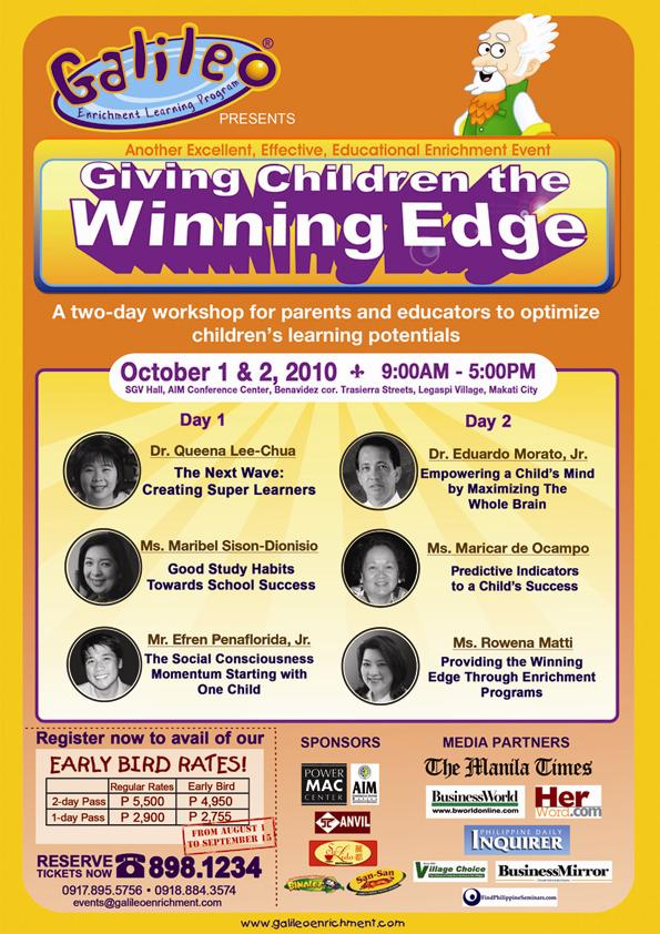 The next generation of leaders and learners needs more than good education. Equipping them with the right skills, the proper attitude towards learning and providing the utmost support will pave the way towards creating model students. To update you with enrichment approaches to building the next generation, the Galileo Enrichment Learning program invites you to a two-day conference on “GIVING CHILDREN THE WINNING EDGE.”
