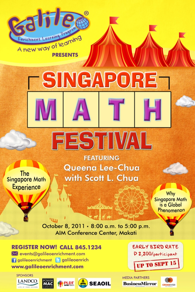 Singapore Math Festival, the country’s first Singapore Math conference will feature Dr. Queena Lee-Chua, a Math Professor and multi-awarded educator. Notable speakers from schools who have adopted the Singapore Math will also share their experiences and teaching successes and how they make this method appropriate for the Filipino child.